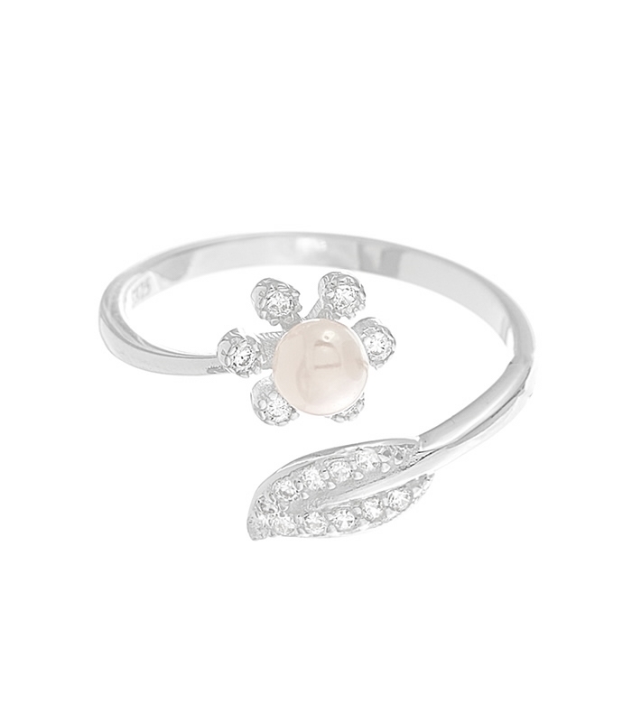 Anillo de plata de ley con Circonita Perla y hoja. Venta mayorista de Plata 925 en Madrid y online